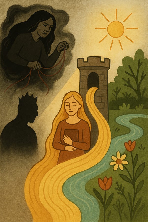 This image marks a threshold. The witch and the abuser no longer define the story. The child who survived, the inner Rapunzel, now steps into her own light. She knows the difference between danger and love. She no longer needs the tower.